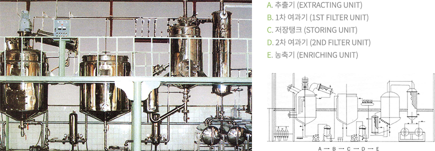 1. 추출 원액을 농출 전에 저장Store the extracted solution before enriched. 2. 스팀사용 압력 : 0.5kg/㎠Manintain the Steam Pressure Within 0.5kg/㎠ 3. 사용온도 : 60℃~70℃Keep the temperature between 60℃~70℃ 4. 가열원리 : 원액 변질 방지Heating prevents the solution from spoiling. |