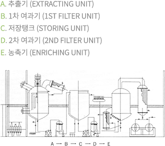 1. 추출 원액을 저장탱크로 옮길 때 펌프가압 - 1차 여과The extracted solution will be first filtered by pumping pressure when passing from the extracter to tank. 2. 저장탱크에서 농축기로 옮길 때 가압 - 2차 여과The first filtered solution will be refiltered when passing from the tack to the enriching unit. 3. 여과포를 2개씩 제작 교체 사용The two pieces of filtering cloth can be replaced by turns. |